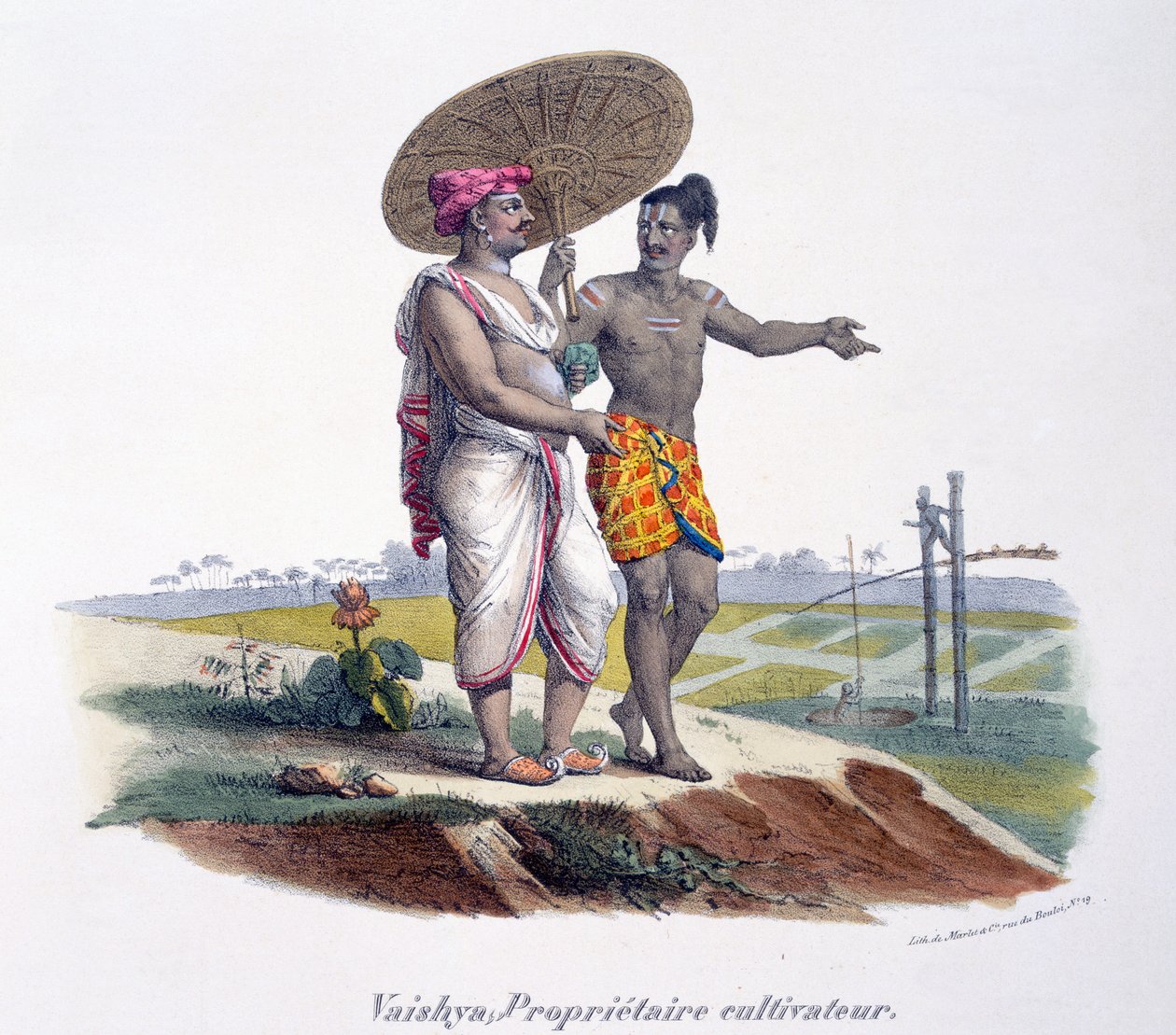 linde francaise · french · india · indian · south asia · asian · colonial era · illustration · illustrations · orientalism · travel · male · traditional dress · costume · parasol · vaishya · caste · agriculture · agricultural · small-holding · garden · gardens · farm · farmer · shaduf · well · landscape · cultivation · cultivating · gesture · gesturing · inspection · inspecting · Private Collection / Bridgeman Images