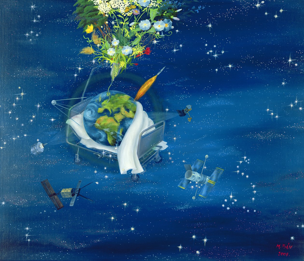 space · universe · solar system · milky way · globe · stars · constellations · rocket · rockets · satellites · flowers · hospital bed · global warming · environment · environmental · polluted · planet · ecological · ecology · carbon footprint · dying earth · infusion · hope · s.o.s. · painting · watercolour · Private Collection / Bridgeman Images |