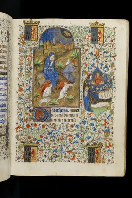 virgin mary · madonna · joseph · infant christ · jesus christ · donkey · manuscript · medieval · angels · floriated border · Fitzwilliam Museum, University of Cambridge, UK / Bridgeman Images
