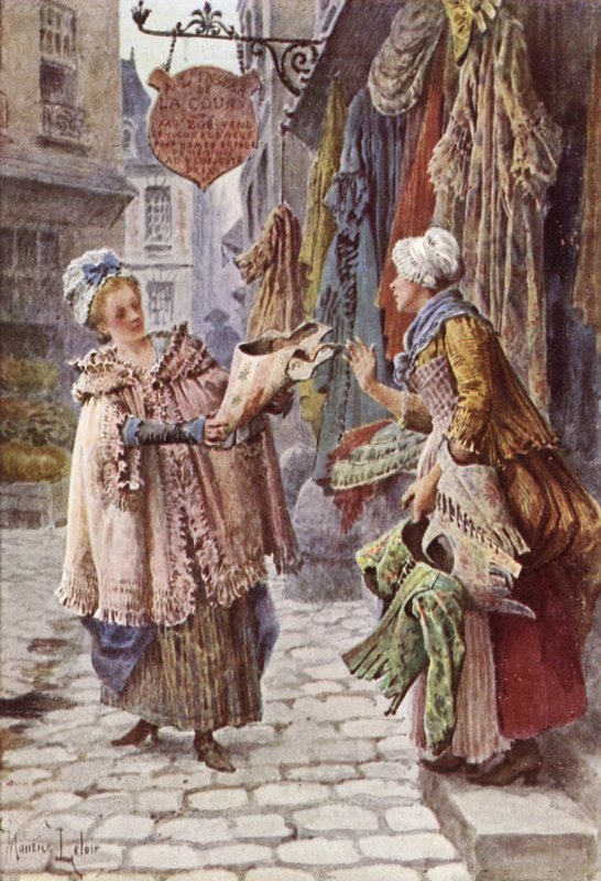 educational · card · cards · france · french · la marchande a la toilette · selling · clothes · dressing · underwear · corset · corsets · dress · 18th century · shop · shopping · retail · street · paris · parisian · Private Collection / Bridgeman Images · / Look and Learn |