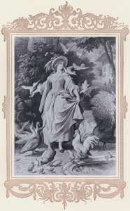 19th century · french · painting · fashion · dress · costume · woman · walking · countryside · rural · birds · feeding · turkeys · gloves · yellow · path · fruit · Private Collection / Bridgeman Images · / Look and Learn |