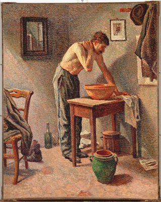la toilette · male · washing · bowl · interior · mirror · chair · bedroom · pointillist · neo-impressionist · cuvette · broc · Petit Palais, Geneva, Switzerland / Bridgeman Images