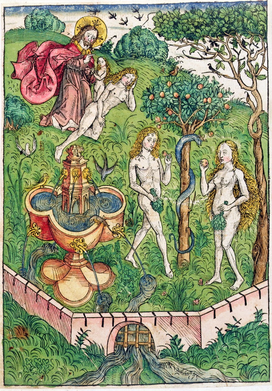 The Creation and the Temptation of Adam and Eve, from 'Le tresor, ou recipient de la vraie richesse du salut de la beatitude eternelle' by Koberger, published in Nuernberg, 1491(The Creation and the Temptation of Adam and Eve, from 'Le tresor, ou recipient de la vraie richesse du salut de la beatitude eternelle' by Koberger, published in Nuernberg, 1491 (colour woodcut))Michael Wolgemut |