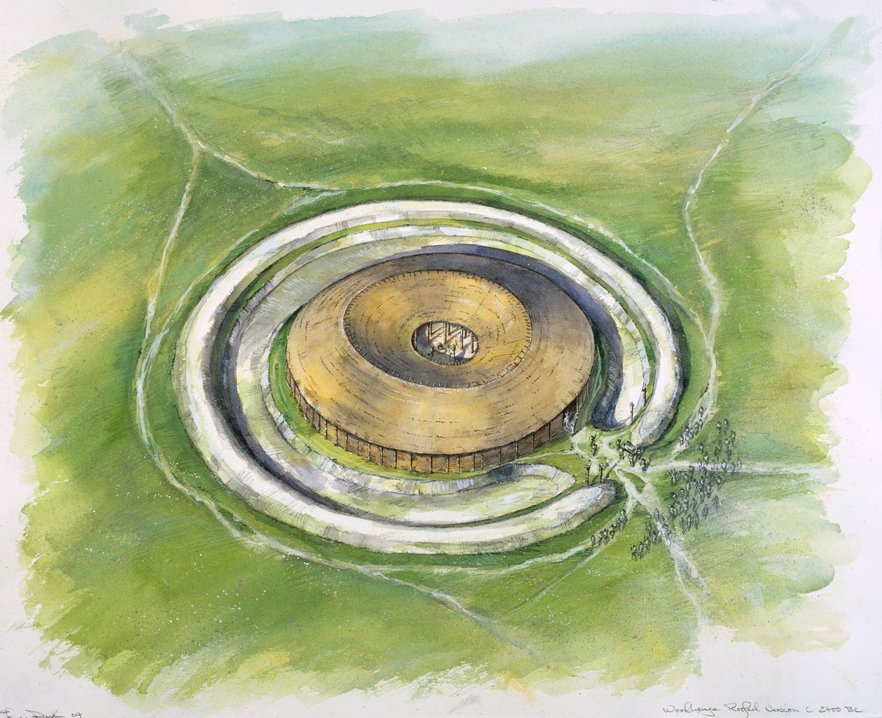 england · timber · architecture · stone age · prehistoric · arts · country · british · english · color · colour · death · roof · wiltshire · location · century · drawing · burial · britain · concept · neolithic · 21st century · aerial view · world heritage site · ancient monument · reconstruction · bird's eye view · unesco · burial site · historic · henge · english heritage · 2000s · 25th century bc · timber circle · landscape · mike seaforth · seaforth · mike · woodhenge · Historic England/Heritage Images |