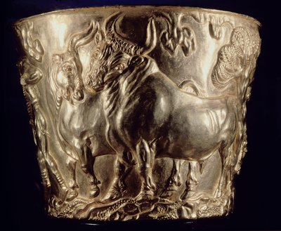Cup depicting a domestic bull, found in the royal tomb of Vaphio, Sparta, late Minoan I, c.1500 BC(Cup, depicting a domestic bull, found in the royal tomb of Vaphio, Sparta, late Minoan I, c.1500 BC (gold) (see also 155940))Minoan |