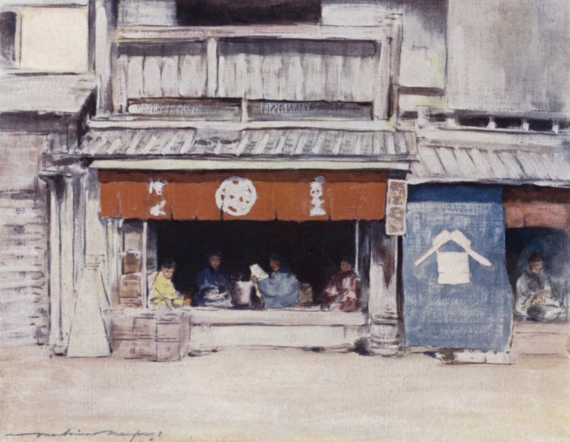 japan · japanese · early · 20th century · picturesque · watercolours · portrait · asian · asia · exotic · summer afternoon · street · shops · Private Collection / Bridgeman Images · / Look and Learn