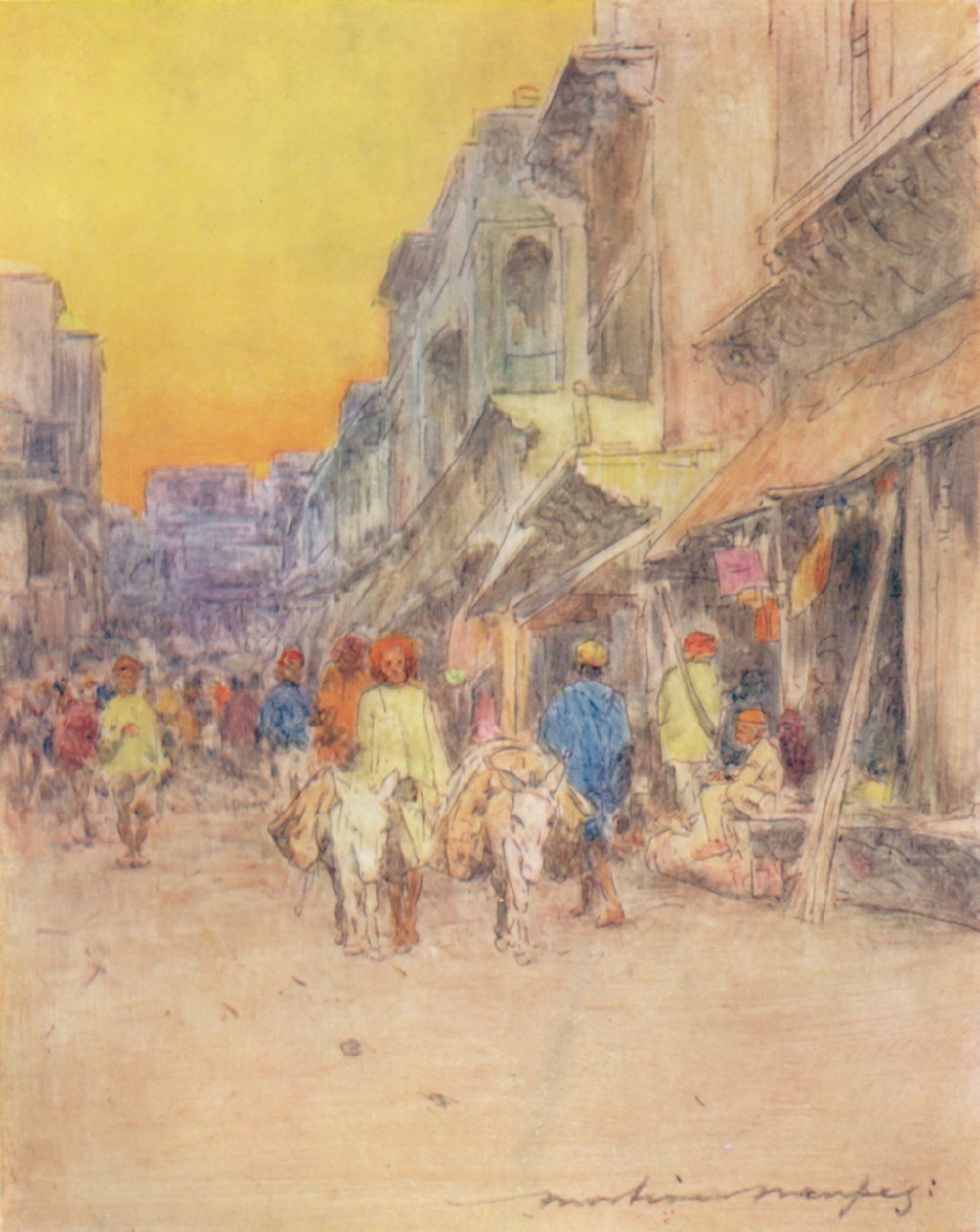 outdoors · animal · road · people · busy · india · architecture · indian · street · shopping · shop · shops · yellow · country · dusk · color · colour · lane · quiet · avenue · perspective · shop front · location · century · donkey · concept · time of day · building exterior · local people · 1900s · 20th century · hindoostan · imperialism · portrait · mortimer luddington menpes · menpes · mortimer luddington · adam and charles black · black · adam and charles · british india · flora annie steel · steel · flora annie · The Print Collector/Heritage Images |