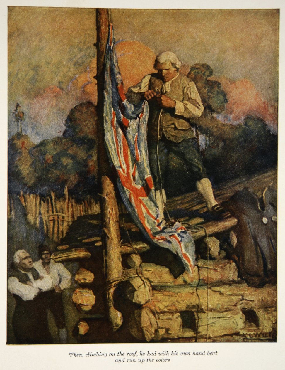 brandywine school · tale · story · childrens book · literature · adventure · captain smollett · flag · stockade · character · colours · Private Collection / Bridgeman Images