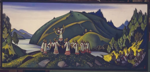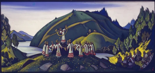 seasons · painting · theatre · spring · traditional · stage · ritual · opera · russia · ballet · folklore · classical music · symbolism · choreography · mystic · sacrificing · ballets russes · set design · the rite of spring · round dance · russian ballet · russian music · russian composer · roerich · rerich · spring landscape · opera · ballet · theatre · stage design · scenic design · theatrical scenic painting · scenic painting · stravinsky · strawinsky · strawinski · tempera on canvas · nicholas roerich · roerich · nicholas 1874-1947 · russian theatre · igor stravinsky · adoration of the earth · fertility gods · le sacre du printemps · rite of spring · Fine Art Images/Heritage Images