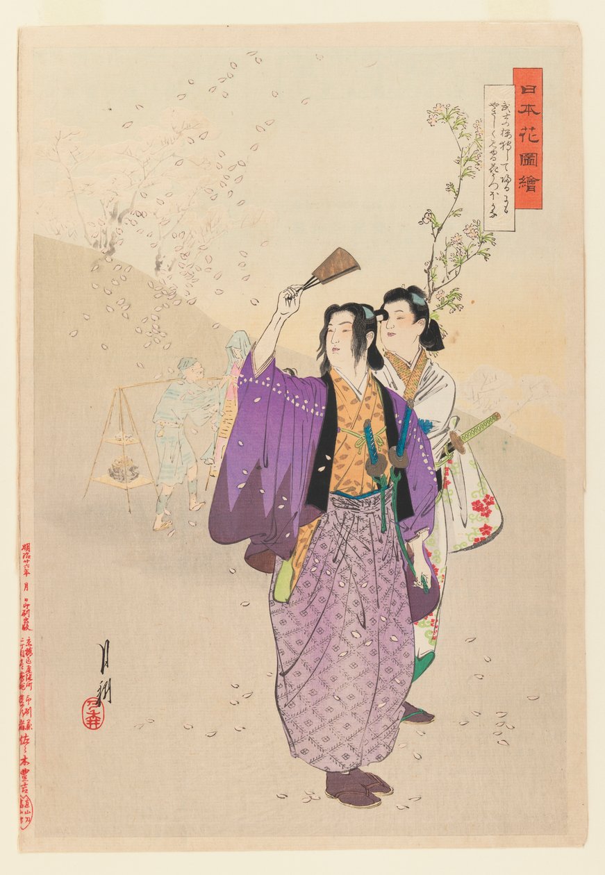 Dandies Admire Falling Cherry Blossoms from the series Pictures of Flower Gardens(Dandies Admire Falling Cherry Blossoms from the series Pictures of Flower Gardens, 1893 (woodblock colour print))Ogata Gekko |