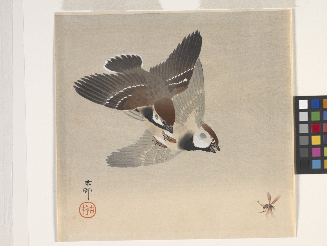 Sparrows Chasing Flying Insect(Sparrows Chasing Flying Insect (colour woodblock print))Ohara Koson |