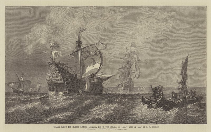 Drake taking the Spanish Galleon Capitana, One of the Armada, to Torbay, 22 July 1588, in the Exhibition of the Society of Painters in Water-Colours(Drake taking the Spanish Galleon Capitana, One of the Armada, to Torbay, 22 July 1588, in the Exhibition of the Society of Painters in Water-Colours )Oswald Walters Brierly |