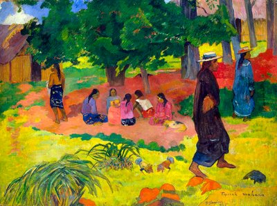 nature · exterior · tree · female · women · woman · people · male · group · sitting · plant · arts · color · colour · colourful · village · location · century · tahiti · afternoon · lady · outside · time of day · impressionist · underneath · daily life · oil painting · shaded · 19th century · impressionism · nineteenth century · oil on canvas · post impressionism · post impressionist · post-impressionism · post-impressionist · paul gauguin · gaugin · eugène-henri-paul gauguin · gauguin · paul · Fine Art Images/Heritage Images