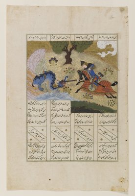 schahname · shahnameh · firdausi · ferdowsi · monster · fighting · creature · hero · heroic · heroism · warrior · iranian · text · horse · riding · Brooklyn Museum of Art, New York, USA / Bridgeman Images