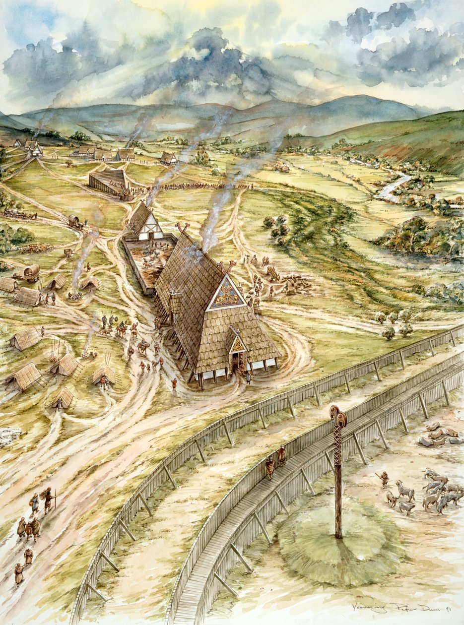 hillside · building · buildings · england · people · arts · country · fence · smoke · view · british · english · color · colour · northumberland · chimney · fortification · settlement · location · century · drawing · vista · britain · concept · 21st century · saxon · reconstruction · elevated view · historic · english heritage · 2000s · 7th century · landscape · arial view · peter dunn · dunn · peter · dunn · p · yeavering · kirknewton · Historic England/Heritage Images |