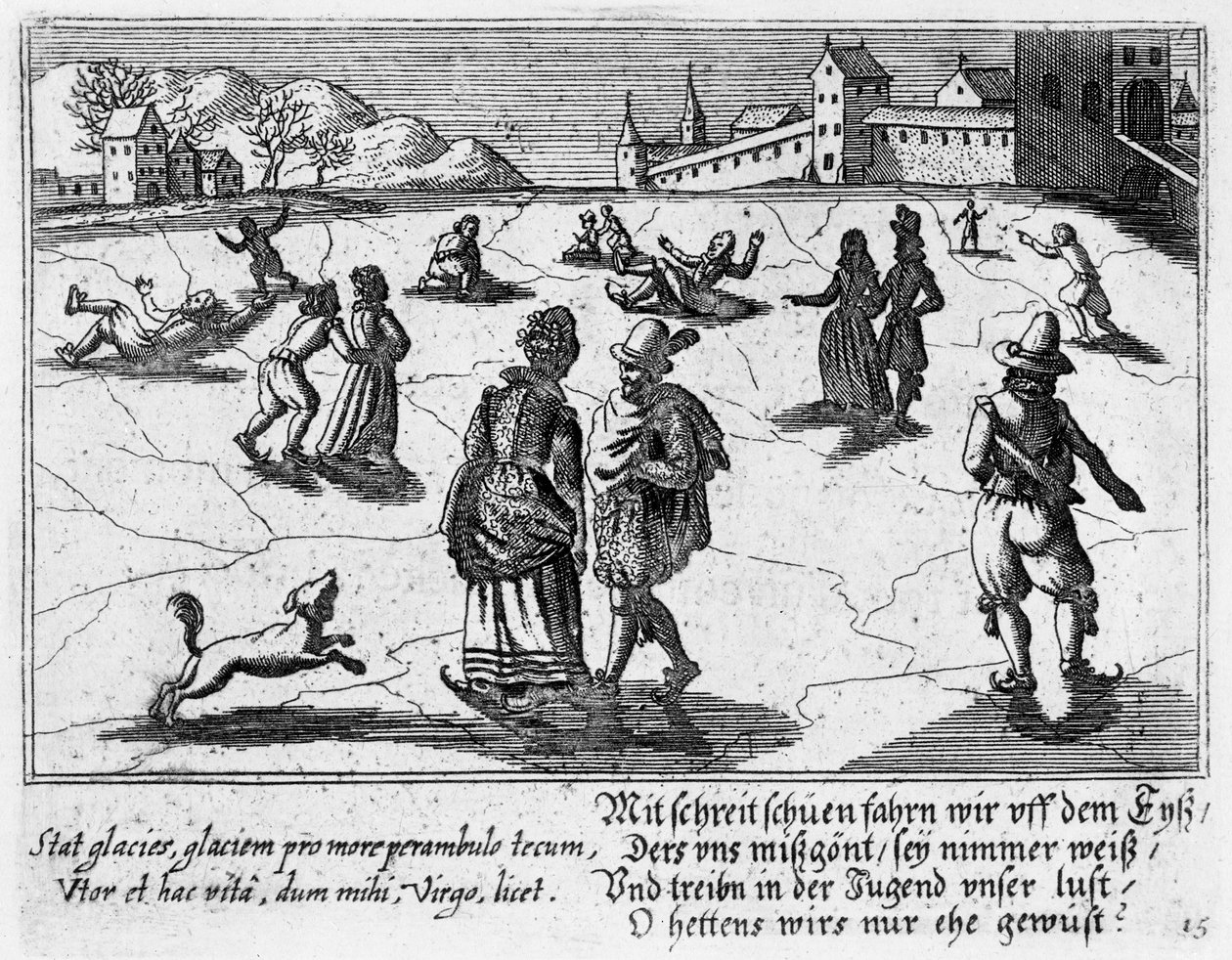daily life · skating · falling · courtship · courting · couples · sport · amusement · amusements · renaissance · baroque · gallant · facetious · emblemata · erotic · eroticism · humour · humourous · mockery · mocking · metaphor · metaphorical · symbolism · symbolic · love · relationship · relationships · latin · german · french · pastimes · wealthy · rich · society · winter · frozen · lake · Private Collection / Bridgeman Images |