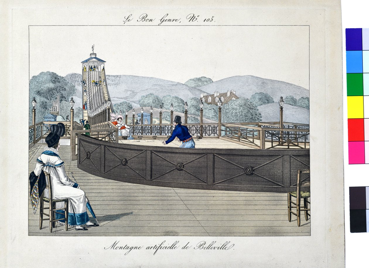 19th century · bourgeoisie · colour · woman · france · europe · louis xviii king of france (1755-1824) · house of bourbon (france) · sledge · fashion · 19th century fashion · roller coaster · game · carousel · umbrella · paris · several people · slide · etching · caricature · leisure · · Ironbridge Gorge Museum Trust, Telford, Shropshire, UK / Bridgeman Images