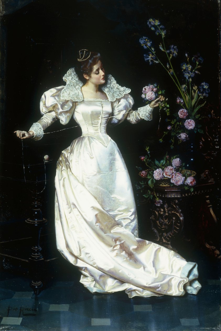 interior · ballgown · style · female · display · arrangement · flower · bouquet · flowers · full length · stylish · wealth · silk · formal · portrait · victorian · admiring · beauty · elegant · elaborate · Private Collection / Bridgeman Images |
