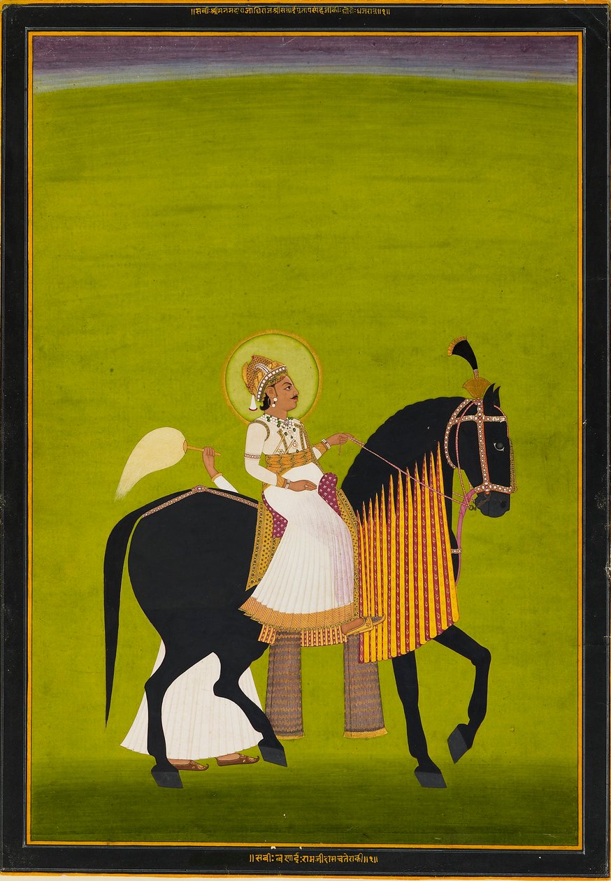 exterior · outdoors · side view · animal · people · black · male · animals · horses · horse · asian · riding · rider · india · asia · indian · bright · arts · painting · country · green · continent · color · colour · profile · royal · gold · horseman · horsemen · location · century · royalty · horseback · outside · attendant · two people · gouache · horsemanship · 18th century · eighteenth century · fanning · hindoostan · maharaja · maharajah · copyspace · portrait · gouache · gold colour · singh · green colour · black colour · ashmolean museum · kachwaha · ramji das · das · ramji · maharaja sawai pratap singh · maharaja sawai pratap · pratap singh of jaipur · Ashmolean Museum, University of Oxford/Heritage Images |