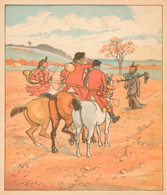 animal · countryside · field · fields · people · male · sport · animals · horses · riding · rider · riders · arts · book · british · color · hunting · rustic · farmland · location · victorian · century · britain · scarecrow · literature · concept · pastime · nursery rhyme · colour · 19th century · huntsman · nineteenth century · rural · book illustration · rural life · randolph caldecott · caldecott · randolph · huntsmen · regionalism · the three jovial huntsmen · The Print Collector/Heritage Images