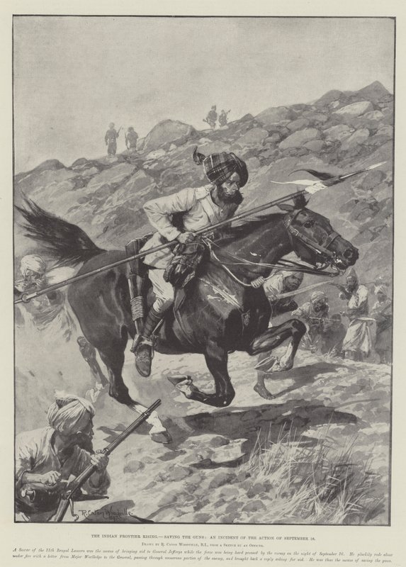 indian frontier rising · saving · guns · incident · action · 16 september · sowar · 11th bengal lancers · general jeffreys · major worlledge · general · india · pakistan · horses · dramatic · military · Private Collection / Bridgeman Images · / Look and Learn |