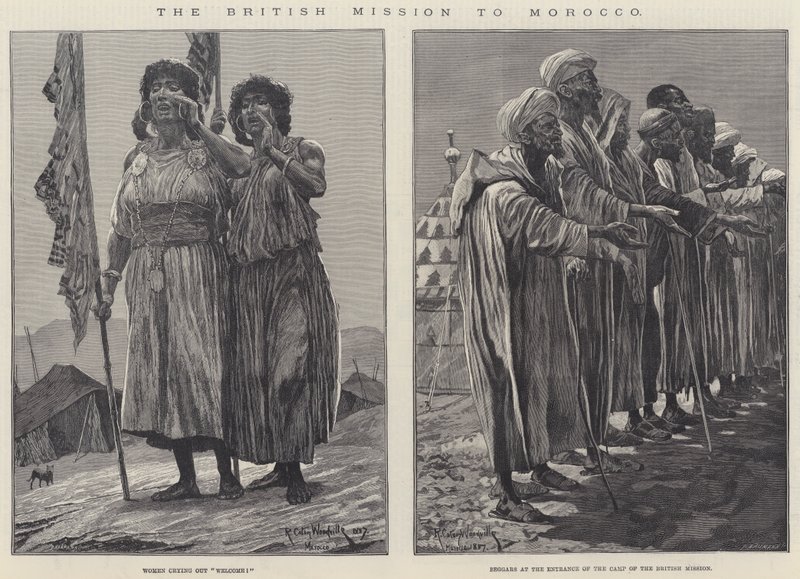 british mission · morocco · women · crying · welcome · beggars · entrance · camp · poverty · Traditional Dress · Private Collection / Bridgeman Images · / Look and Learn |