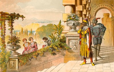 shakespeare william (1564-1616) · garden · costume · female · palace · costumes · coloured etching · exterior · character · play · architecture · tragedy · act iii · male · scene iii · characters · illustration · cassio · shakespearean · emilia · desdemona · iago · othello · Private Collection / Bridgeman Images