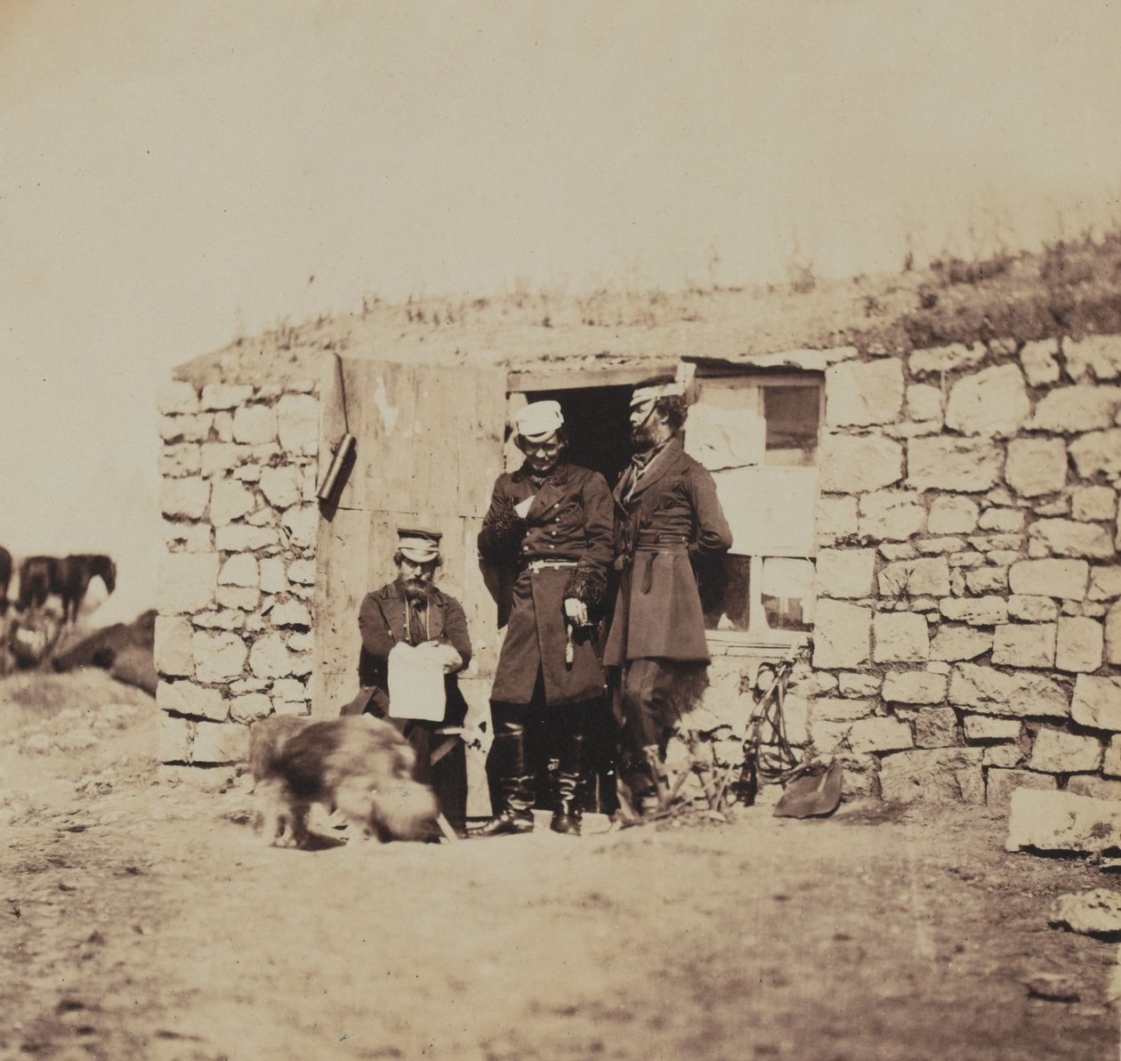 soldier · soldiers · male · group portrait · british army · officer · victorian · crimea · stone hut · camp · encampment · lieutenant general · military uniform · National Army Museum, London / Bridgeman Images