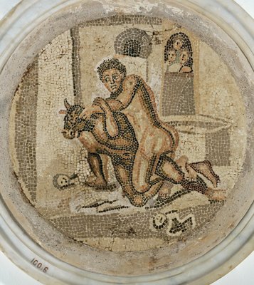 Roman art: Theseus fighting the minotaur. Mosaic from the site of Pompei. 1st to 3rd century AD. Naples, Museo Archeologico Nazionale(Roman art: “” Thesee fighting the minotaur””” Mosaic coming from the site of Pompei. 1st to 3rd century AD. Naples, Museo Archeologico Nazionale)Roman |