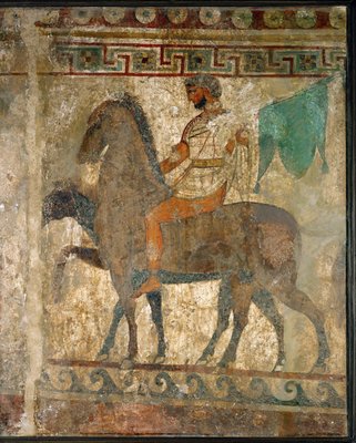 Samnite Rider (4th century BC) from Paestum, Italy. Fresco. Archaeological Museum of Naples(Samnite rider. Tomb painting from the 4th century BC, from the site of Paestum, Italy. Fresco. Museo nazionale archeologico, Napoli (Archeological Museum of Naples).)Roman |