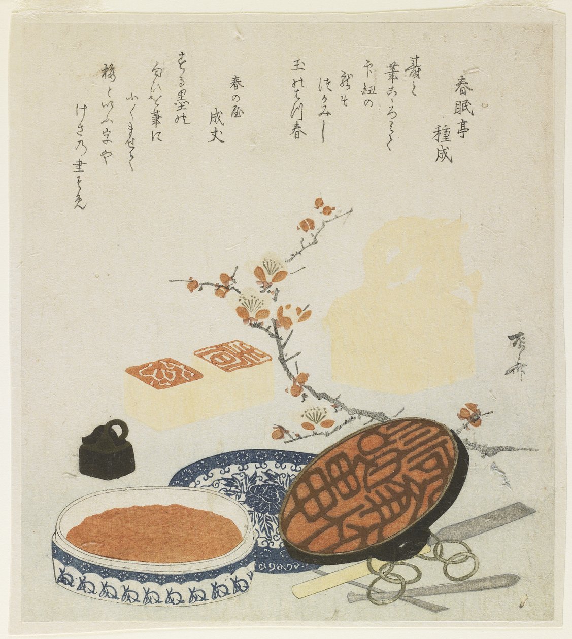 Seals, Carving Tools, Porcelain Ink Box and Plum Branch, 1820((Seals, Carving Tools, Porcelain Ink Box and Plum Branch), 1820)Ryuryukyo Shinsai |