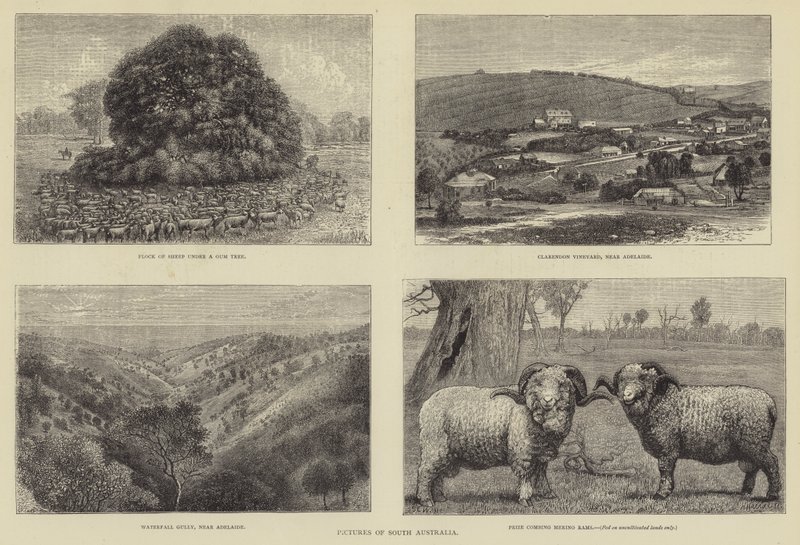 pictures · south australia · flock · sheep · gum tree · clarendon vineyard · adelaide · waterfall gully · prize combing merino rams · Private Collection / Bridgeman Images · / Look and Learn |