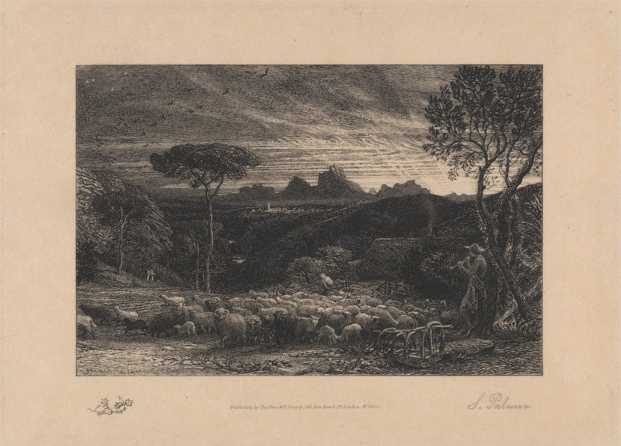 dark · daybreak · sunrays · trees · shepherd · herd · plains · mountains · clouds · opening · Fold