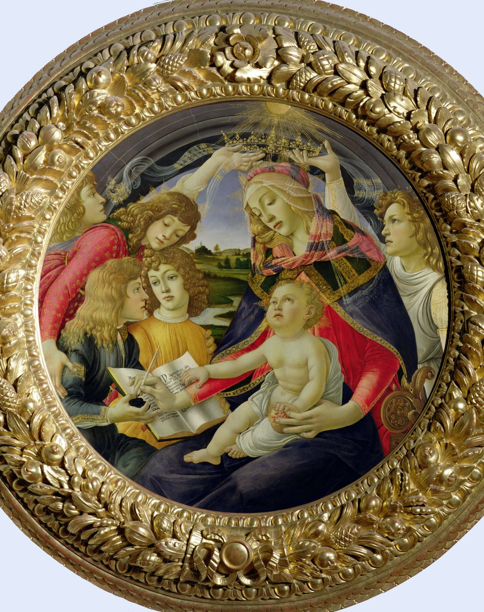 crown · pomegranate · virgin and child · round · book · tome · inkwell · quill · writing · crowning · light · coronation · halo · tondo · renaissance · mother · mary · jesus · christ · infant · five angels · angel · la vierge du magnificat · enfant · grenade · roundel · Galleria degli Uffizi, Florence, Italy / Bridgeman Images
