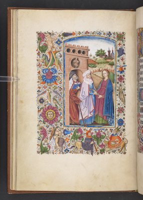 decoration · decorated · decorative · ornate · ornamental · christian · religious · birds · book · floral · motif · elizabeth · century · visits · spanish · flowers · manuscript · medieval · pattern · text · 15th · foliage · hours · devotional · virgin · illumination · visiting · architecture · christianity · visit · miniature · border · book of hours · illuminated · stylised · religion · madonna · mary · cousin · British Library, London, UK / Bridgeman Images