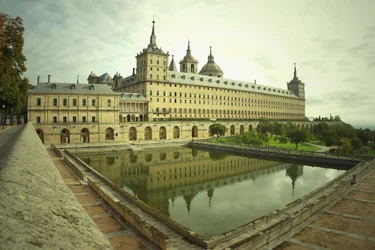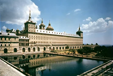 palace monastery · madrilenos · philip · mausoleum · spanish landscape · architecture · intellectual centre · library · towers · dome · reflection · pond · pool · exterior · biblioteca · monasterio · El Escorial, Madrid, Spain / Bridgeman Images