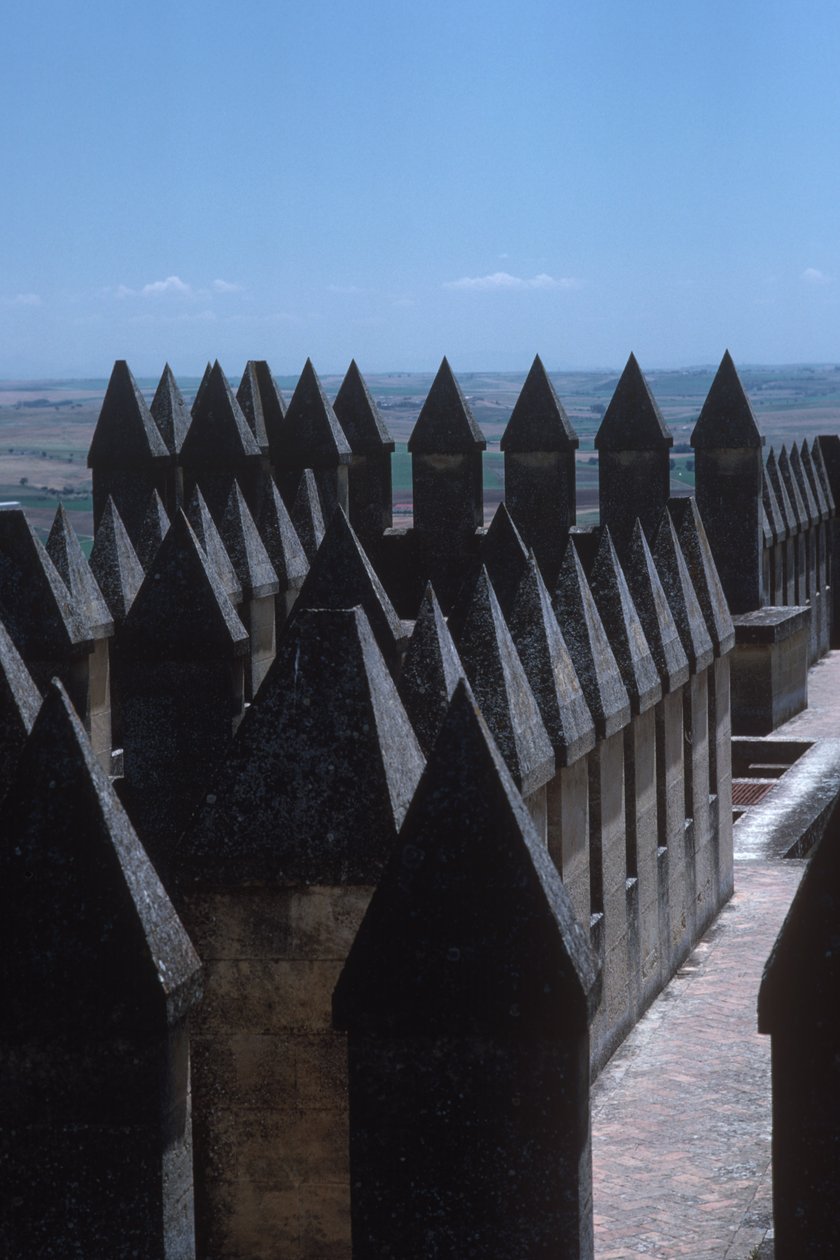 turrets · turreted · crenellations · crenellated · castellated · ramparts · rampart · aerial view · tower · fortress · fortification · architecture · hostile · defence · defensive · points · pointed · sharp · landscape · heat · Moorish · Almodovar del Rio, Andalucia, Spain / Bridgeman Images |