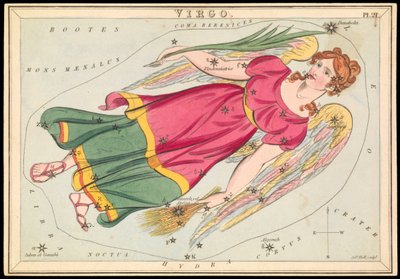 19th century · angel · astronomy · celestial map · constellation · colour · star · woman · mythology · mythological figure · symbol · one person · virgo (horoscope) · zodiac sign · astrology · print · mzprint · National Maritime Museum, London, UK / Bridgeman Images