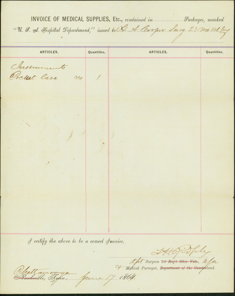Lists supplies issued to H.A. Cooper, surgeon of the 23rd Missouri Volunteer InfantryT. H. Ridgely |