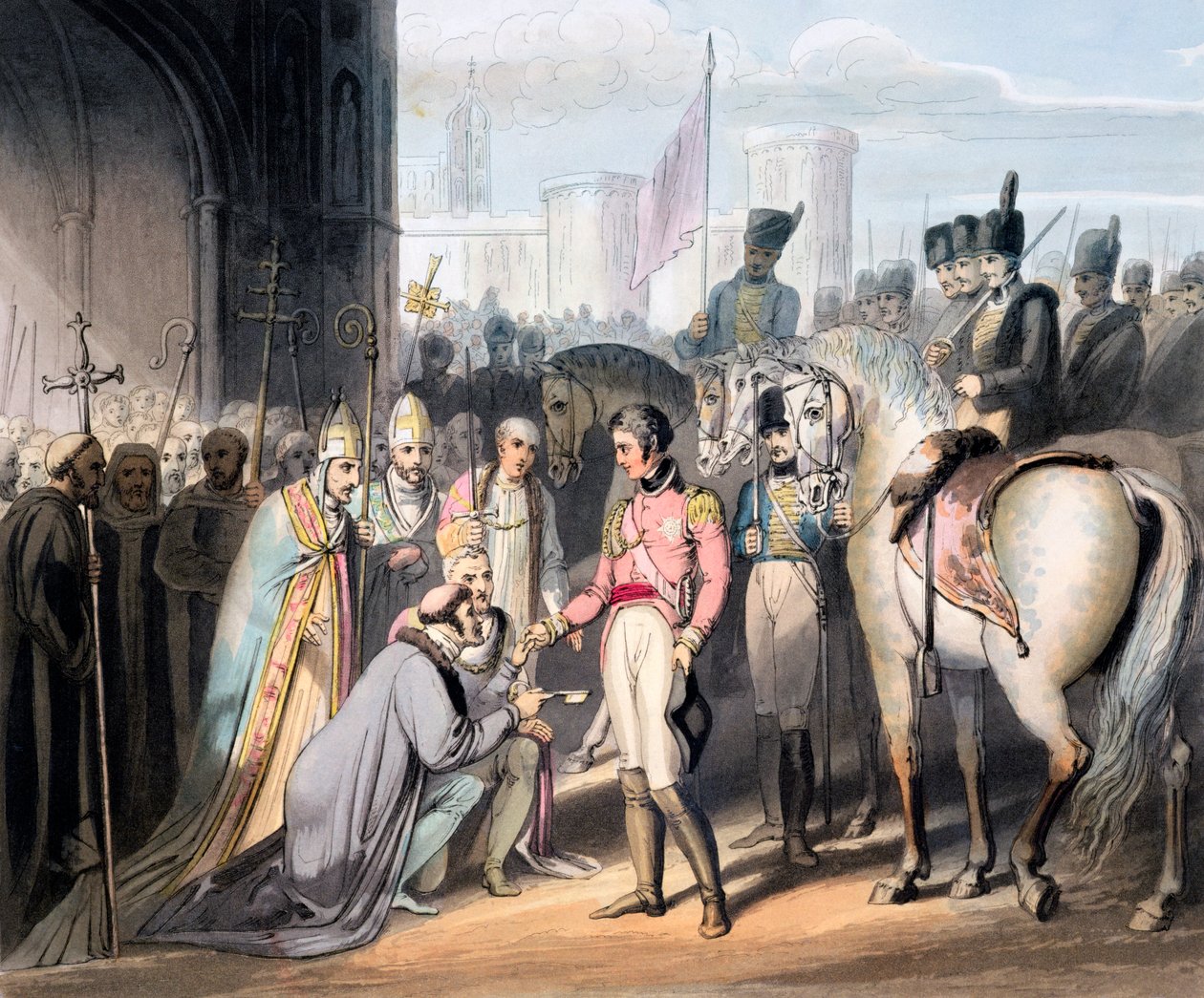 animal · people · male · animals · horses · horse · religious · religion · spain · madrid · british · color · colour · christianity · mounted · century · liberation · britain · welcome · welcoming · general · soldiers · soldier · priest · horseback · concept · cavalry · grateful · gratitude · thankful · army · warfare · cleric · clergyman · commander · 19th century · liberator · thanking · nineteenth century · napoleonic wars · peninsular war · engraving · richard · richard westall · westall · duke of wellington · 1st duke of wellington · arthur wellesley · the iron duke · iron duke · t fielding · historica graphica collection · wellington · duke of · wellesley · arthur · 1st duke of wellington · fielding · t · Historica Graphica Collection/Heritage Images