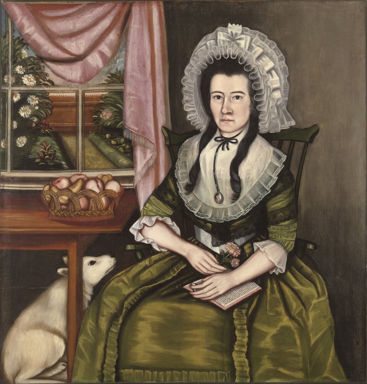 painting · america · united states · american · colonial america · british colony · new england · portrait · woman · female · naive · primitive · folk · naive painting · primitive art · folk art · seated · sitting · three-quarter length · garden · window · reading · flower · frill · revolutionary period · new haven · connecticut · book · revivalist · meditations · fruit · locket · US · North America · Yale University Art Gallery, New Haven, CT, USA / Bridgeman Images