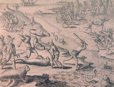 16th century · bry theodore de (1528-98) · illustrator · elizabethan era (1558–1603) · england · united kingdom · europe · ships · hunt · privateer · killing sea lions · exploration · sailors · new world · hunting · natives · explorer · america · clubbing · thomas cavendish · Private Collection / Bridgeman Images
