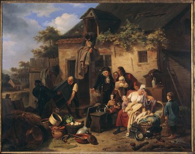 baby · babies · infant · newborn · new born · new-born · newly born · new born infant · new born babes · new baby · toddler · toddlers · walking stick · cane · poor · poverty · pans · sale · suffering · furniture · goods · hardship · auctioning · auction · possessions · property · selling · mother · family · painting · Mzpainting · Museum voor Schone Kunsten, Ghent, Belgium / Bridgeman Images