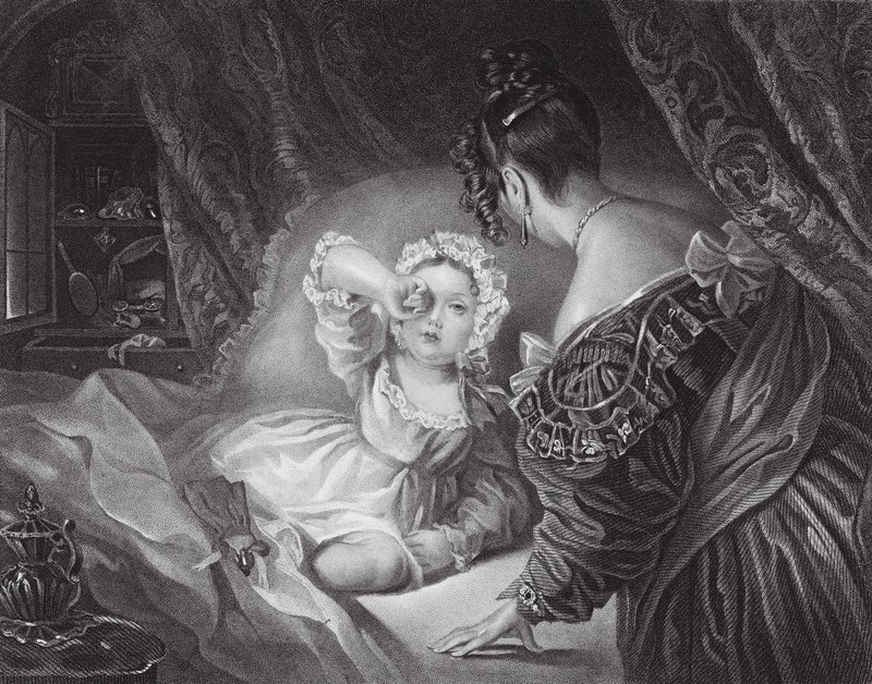 19th century · bedroom · house · housing · costume · childhood · child · tiredness · woman · girl · engraving · furniture · morning · mother · parent · family · black and white · dress · clothes · daughter · mzengraving · · Private Collection / Bridgeman Images · / Look and Learn |