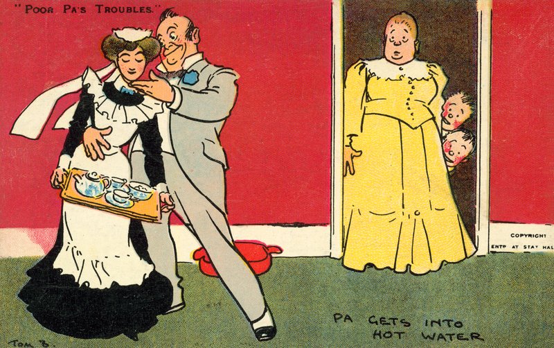 postcard · postcards · humour · humorous · funny · social · criticism · joke · jokes · amusing · father · mother · wife · children · kissing · maid · servant · sexual · harrassment · troubles · love · frustration · uniform · stroking · chin · advances · Private Collection / Bridgeman Images · / Look and Learn |