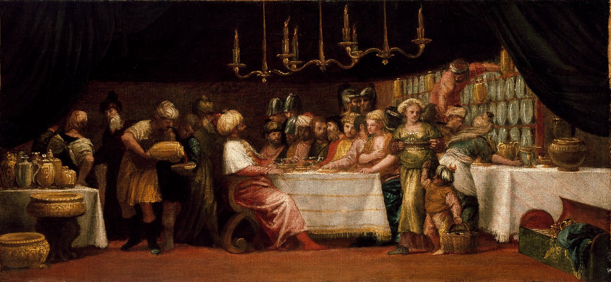 italy · italian · food · female · women · woman · people · male · interior · indoors · group · religious · night · country · marriage · religion · chandelier · occupation · room · color · colour · eating · lighting · photography · dining · table · judaism · jewish · renaissance · location · century · profession · inside · general · furniture · lady · face to face · time of day · banquet · feast · servant · metaphor · hebrew · old testament · widow · 16th century · sixteenth century · assyria · assyrian · banqueting · banqueting hall · holofernes · judith · oil on canvas · panoramic photography · portrait · unknown · paolo · paolo veronese · paolo caliari · veronese · paulo · paulo veronese · caliari · letterbox format · ashmolean museum · pablo verones · Ashmolean Museum, University of Oxford/Heritage Images