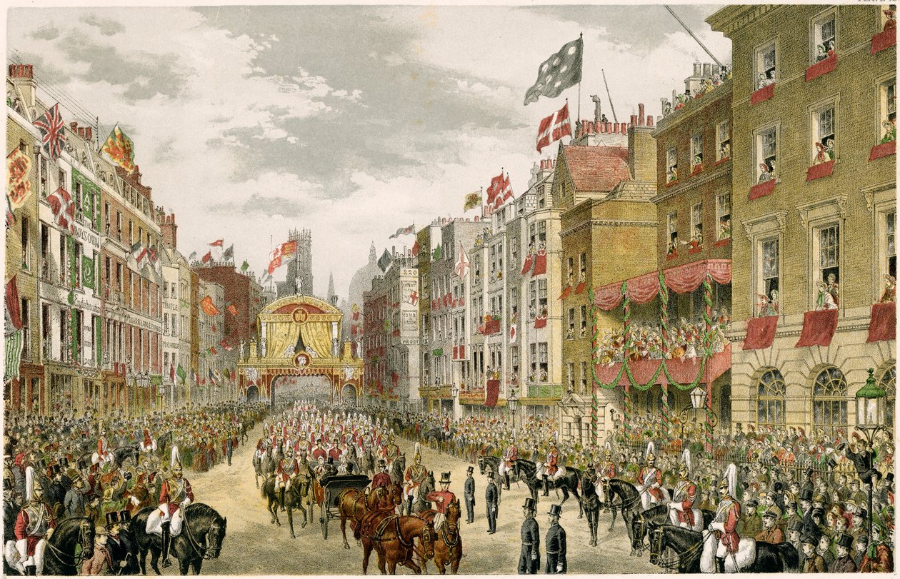 transport · transportation · princess alexandra · alexandra of denmark · processional · prin · road · building · buildings · london · england · people · event · crowds · houses · street · country · watching · british · celebrations · english · color · colour · enthusiasm · lane · royal · avenue · celebration · cheering · celebrating · carriage · entrance · gate · westminster · location · victorian · century · procession · britain · soldiers · soldier · royalty · princess · horseback · concept · temple bar · enthusiastic · strand · escort · prince · household cavalry · road transport · 19th century · nineteenth century · city of westminster · english heritage · escorting · prince of wales · princess of wales · royal event · royal wedding · the strand · engraving · unknown · queen · sir william howard russell · russell · sir william howard · william howard russell · william howard · wh russell · queen alexandra · alexandra · alexandra caroline mary charlotte louisa julia · Historic England Archive/Heritage Images