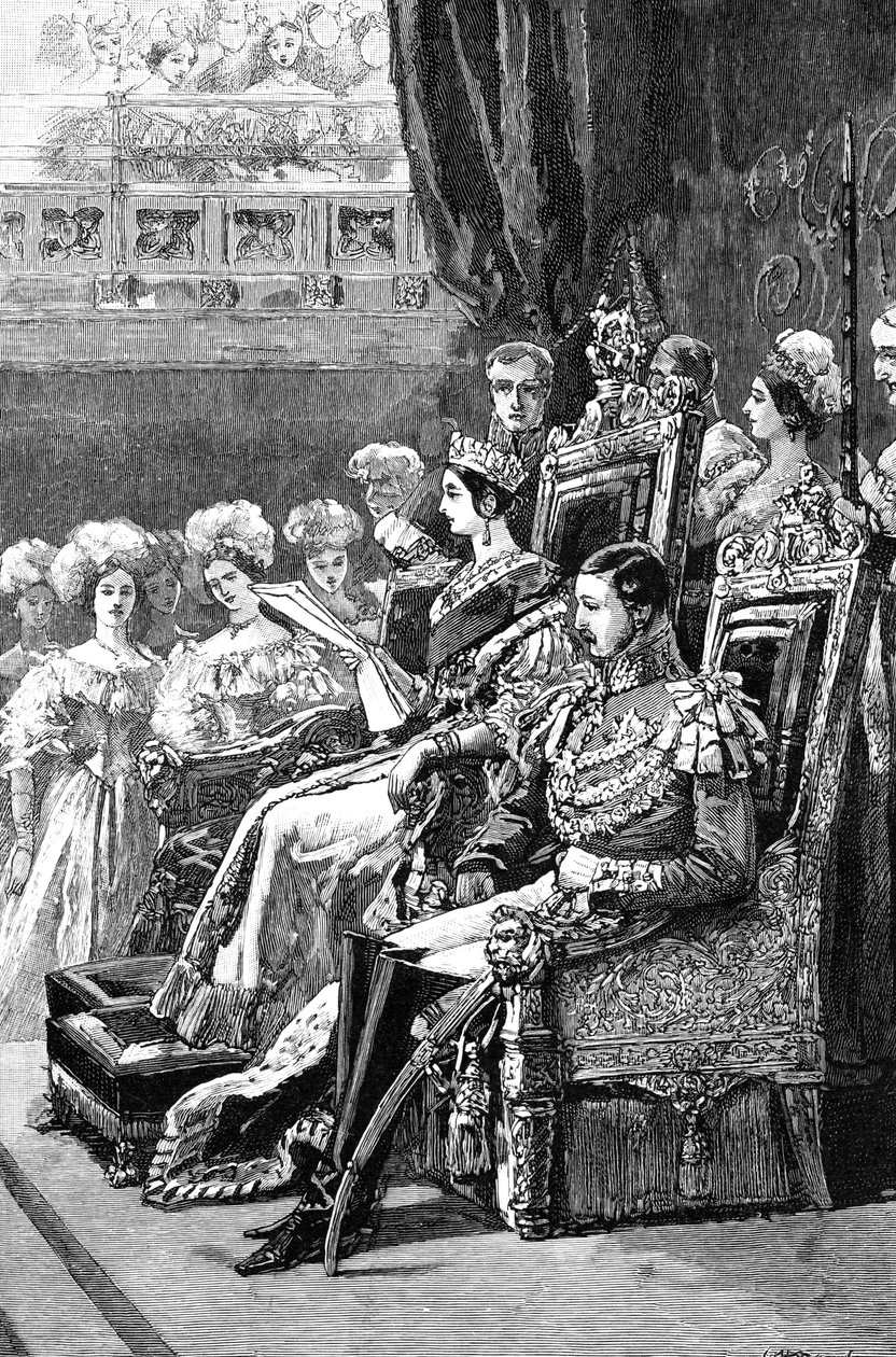 female · women · woman · people · male · event · crowd · opening · ceremony · couple · politics · monarch · british · queen · royal · uniform · parliament · dress · victorian · century · britain · royalty · lady · concept · monochrome · ermine · prince · military uniform · 19th century · black white · black and white · throne · nineteenth century · opening ceremony · opening of parliament · royal event · sovereign · state occasion · state opening of parliament · prince albert · queen victoria · victoria · albert · engraving · portrait · unknown · queen of great britain and ireland · robert · prince consort · prince albert of saxe-coburg-gotha · saxe-coburg-gotha · albert · wilson · robert wilson · The Print Collector/Heritage Images