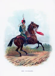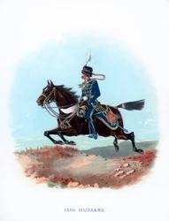 animal · people · male · animals · horses · horse · riding · rider · british · weapon · weapons · color · colour · uniform · dress · horseman · horsemen · sword · britain · soldiers · soldier · swords · concept · rearing · cavalry · army · warfare · plume · hussar · regiment · weaponry · british army · cavalry officer · hussars · chromolithograph · unknown · The Print Collector/Heritage Images