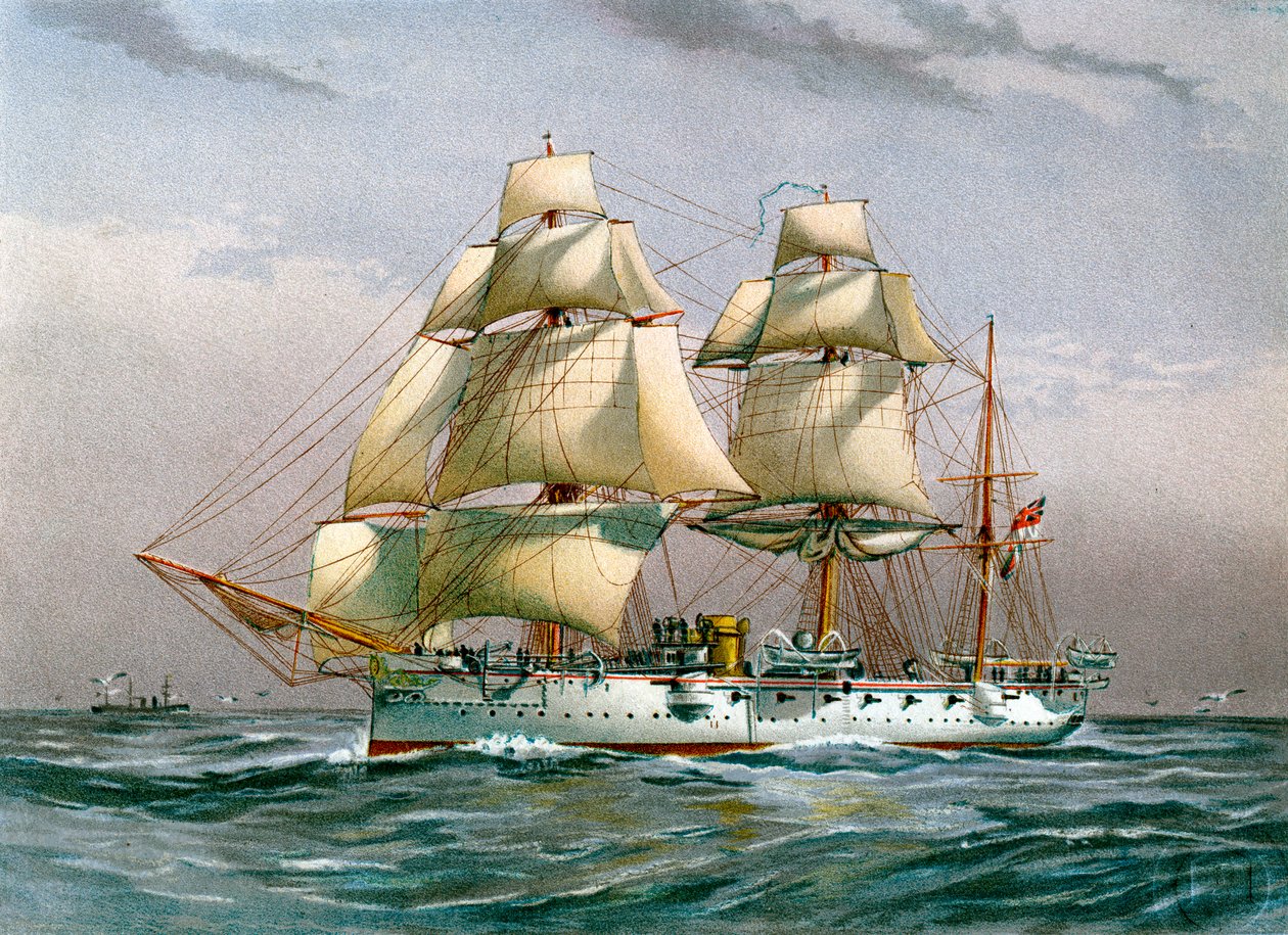 transport · transportation · water · flag · flags · seascape · ship · ships · british · geography · color · colour · cruiser · century · banner · britain · sail · concept · funnel · navy · standard · warfare · sailing ship · steamship · naval warfare · 19th century · water transport · warship · nineteenth century · royal navy · geographical feature · white ensign · chromolithograph · unknown · charles rathbone low · charles rathbone · chas rathbone low · hms calliope · The Print Collector/Heritage Images